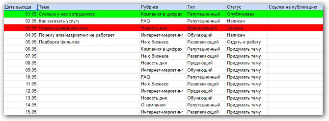 Конкретная дата помогает заранее распределять нагрузку по подготовке контента и не пропускать день публикации. Фиксируйте статусы своевременно: написать или отдать автору, в разработке, размещен или замена. В дополнительном столбце можно давать ссылку на опубликованный контент, чтобы быстро к нему перейти при необходимости.
