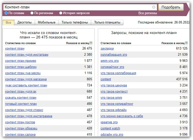 Количество показов и похожие запросы по словосочетанию «Контент-план» в Яндекс.Вордстат