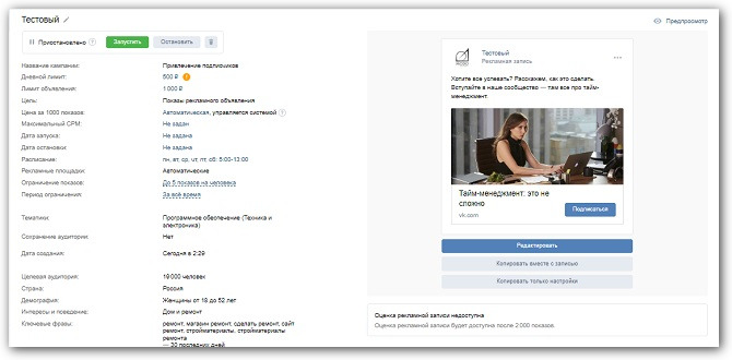После создания рекламной записи она отправляется на модерацию. Если ошибок не обнаружат, то показ рекламы начнется автоматически: