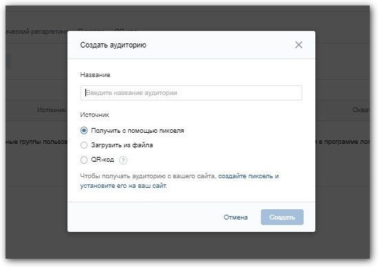 В рекламном кабинете ее можно создать, чтобы «догреть» до покупки или действия, которого он так и не сделал: подписаться, оставить заявку и так далее. Для этого нужно добавить пиксель, который установлен на сайте или загрузить базу номеров или имейл-адресов, если они есть: