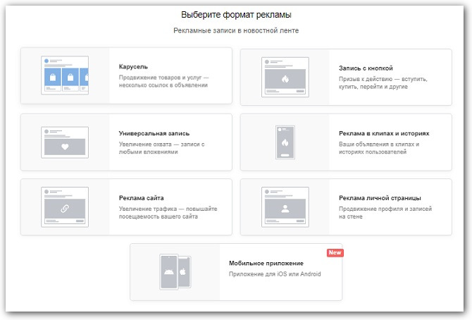 На выбор есть 13 целей для продвижения сообщества или личной страницы, сайта или товаров из каталога, приложений, видео и сбора заявок: