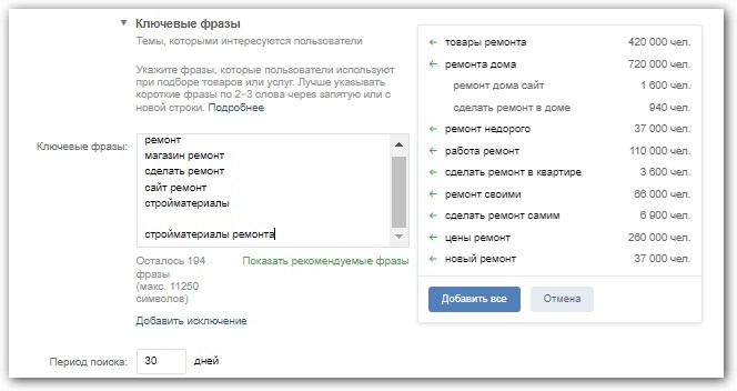 Ключевые фразы — это то, что люди вводят для поиска нужной им информации. Система ВКонтакте считывает эти показатели и использует для таргетинга. Например, человек делает ремонт и его поисковые запросы состоят из «ремонт своими руками», «купить плитку», «магазин стройматериалов» и тому подобное. Это и нужно отразить в ключевых фразах. ВКонтакте автоматически помогает подобрать ключевики, основываясь на тематике вашего сообщества, тексте в объявлении. Вам нужно только выбрать подходящие: